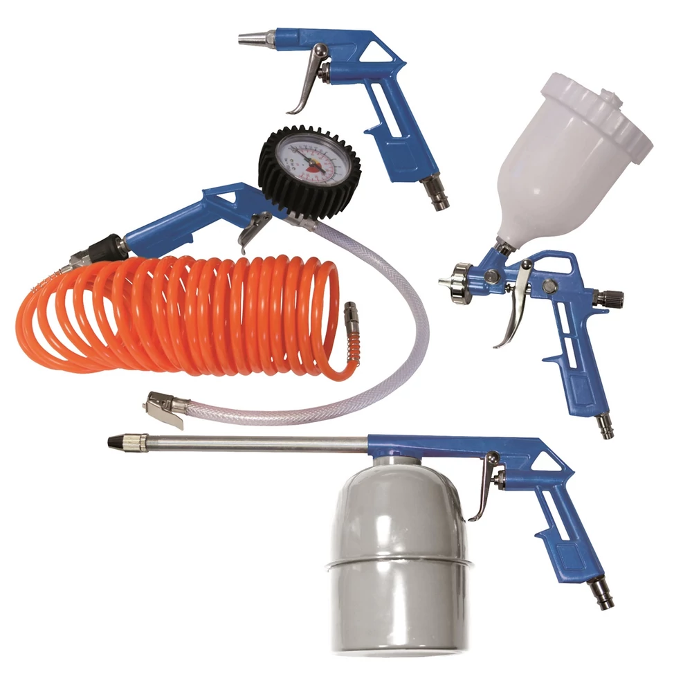 Kompresszor kiegészítő szett 5 részes Nagyon praktikus és közkedvelt kiegészítő szett, amelyet jól lehet hasznosítani az összes hagyományos kompresszornál A fémötvözetből készült szerszámok gyorscsatlakozóval vannak ellátva A szett tartalma: Fúvópisztoly-tisztításhoz vagy a nehezebben hozzáférhető helyek szárításához Kerékfújó pisztoly manométerrel, védősapkával, kettős skálával (bar/PSI), leeresztő gombbal Félsótartályos festékszóró pisztoly általános festési műveletekhez 5 m-es spiráltömlő gyorscsatlakozóval Lemosópisztoly-fémtartállyal a felület könnyű tisztításához és zsírtalanításához